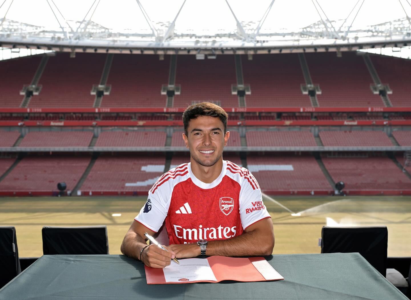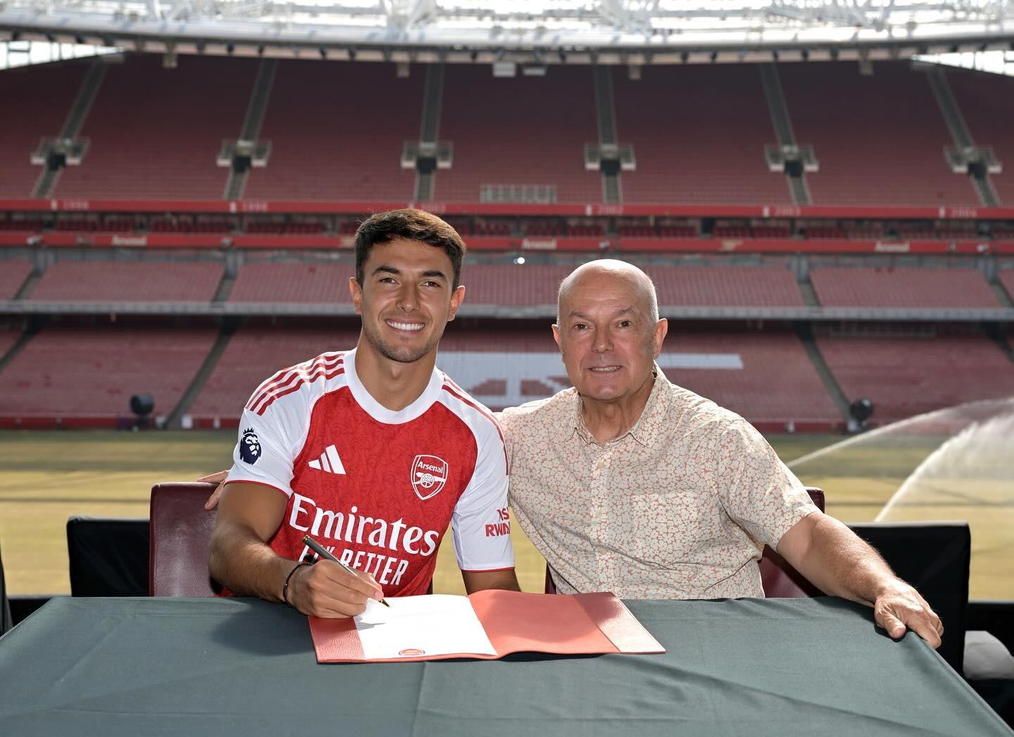 在加盟阿森纳后,苏比门迪在社交媒体晒出签约照,并配文:“新篇章,新家。”