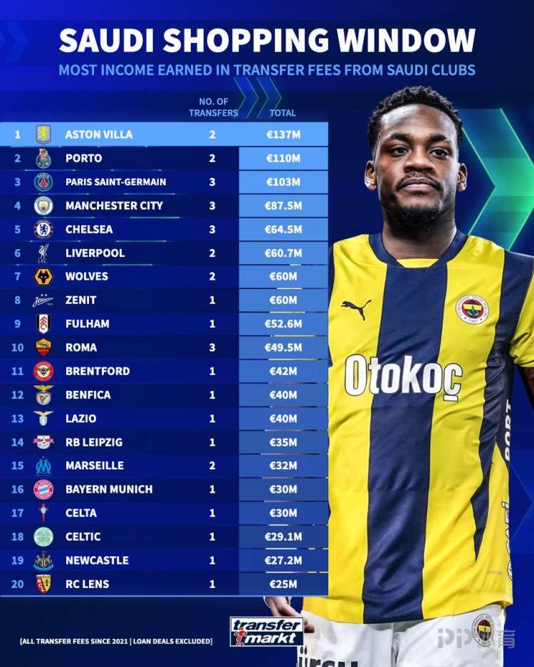 德转统计各俱乐部向沙特球队卖人收入,维拉以1.37亿欧居首,波尔图1.1亿欧第二,巴黎1.03亿欧第三。