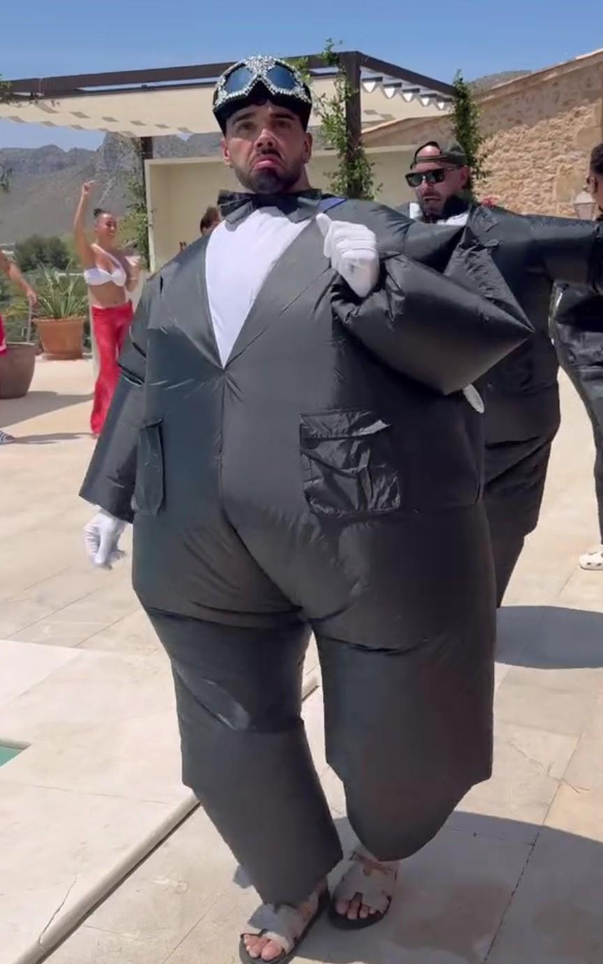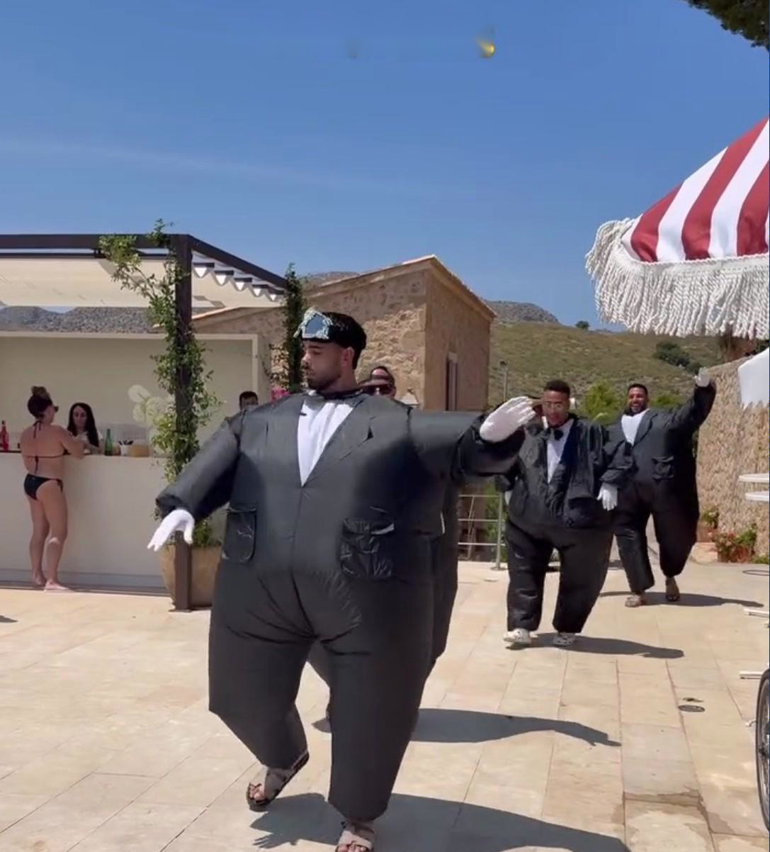 拉亚和他的伴郎们身穿充气燕尾服,滑稽地跳舞进入婚礼场地,这群开心的人通过跳舞来庆祝这一时刻。