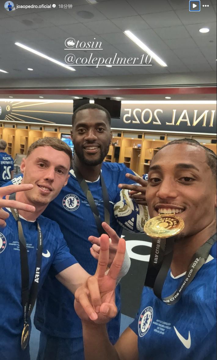 赛后,若昂-佩德罗在社交媒体晒出他和队友帕尔默、阿达拉比奥尤的合照,对着镜头展示冠军奖牌。