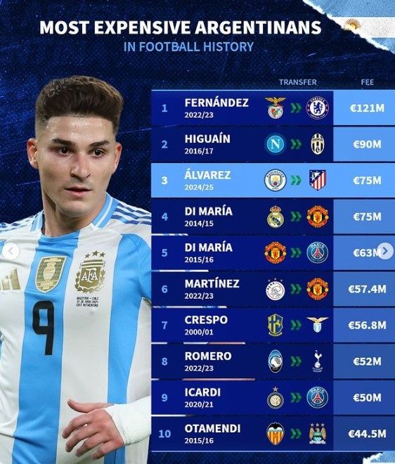 马竞官方宣布,球队以7500万欧元基础转会费外加2000万欧元浮动的费用,签下了阿根廷前锋阿尔瓦雷斯,鉴于浮动费用是否触发存在变数,目前阶段先按75M来计算。《转会市场》指出,阿尔瓦雷斯成为历史上第三高价转会的阿根廷球员。前十名是谁?不妨予以盘点。