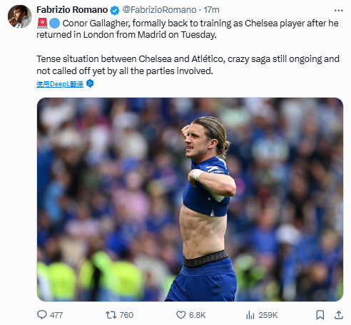 罗马诺社媒写道: “康纳-加拉格尔周二从马德里返回伦敦后,正式以切尔西球员的身份恢复训练。切尔西和马德里竞技之间的局势仍然很紧张。”