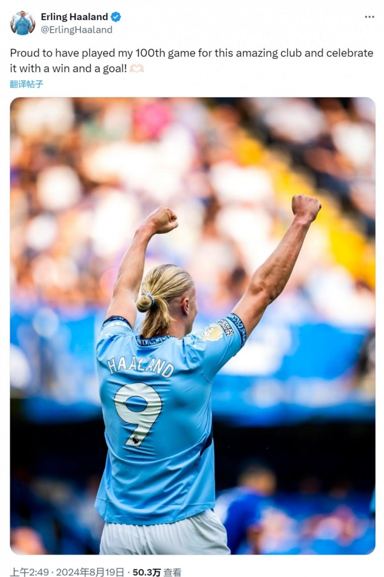 北京时间8月19日讯,英超首轮焦点战,曼城客场2-0完胜切尔西。此役,哈兰德在上半场取得进球帮助球队获胜。值得一提的是,本场比赛是哈兰德为曼城第100次出战,赛后,哈兰德也在社交媒体上晒出庆祝的照片,并写道:“我很自豪能为这家了不起的俱乐部出战第100场比赛,并用一场胜利和一个进球来庆祝。”