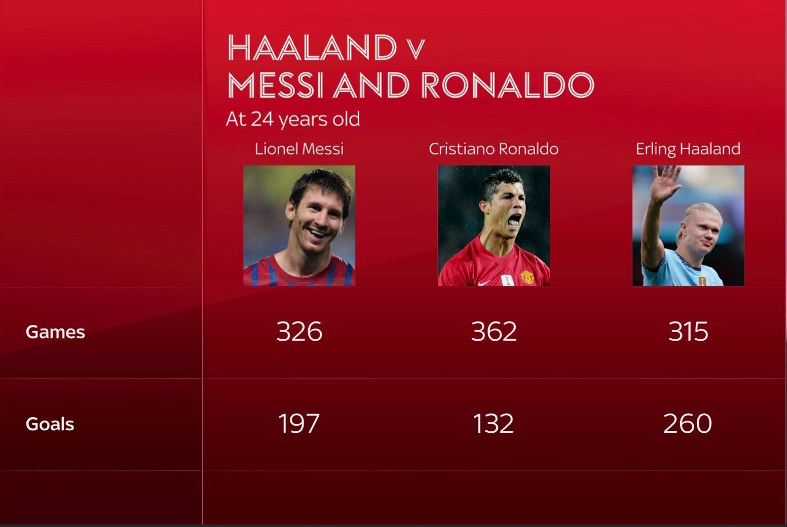 今年24岁的哈兰德,目前参加了315场比赛,打入了260球——这项统计里还没有把他痛刷数据的那些非成年队比赛(比如挪威各级国青队)算上,还是比较严谨的。具体来说,在萨尔茨堡是27战打入29球,在挪威莫尔德是50战20球,在德甲多特蒙德是89战86球,在曼城是101战94球,在挪威国家队是33战31球,进球效率确实超过了同龄段的梅西、C罗。