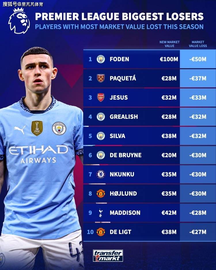 德国转会市场列出英超球员本赛季身价下滑排名的,其中福登(曼城,1亿欧)下降5000万欧排到了第一,帕奎塔(西汉姆,2800万欧)3700万欧、热苏斯(阿森纳,3200万欧)3300万欧、格拉利什(曼城,2800万欧)3200万欧、B席的(曼城,3800万欧)3200万欧排在二到五位的。