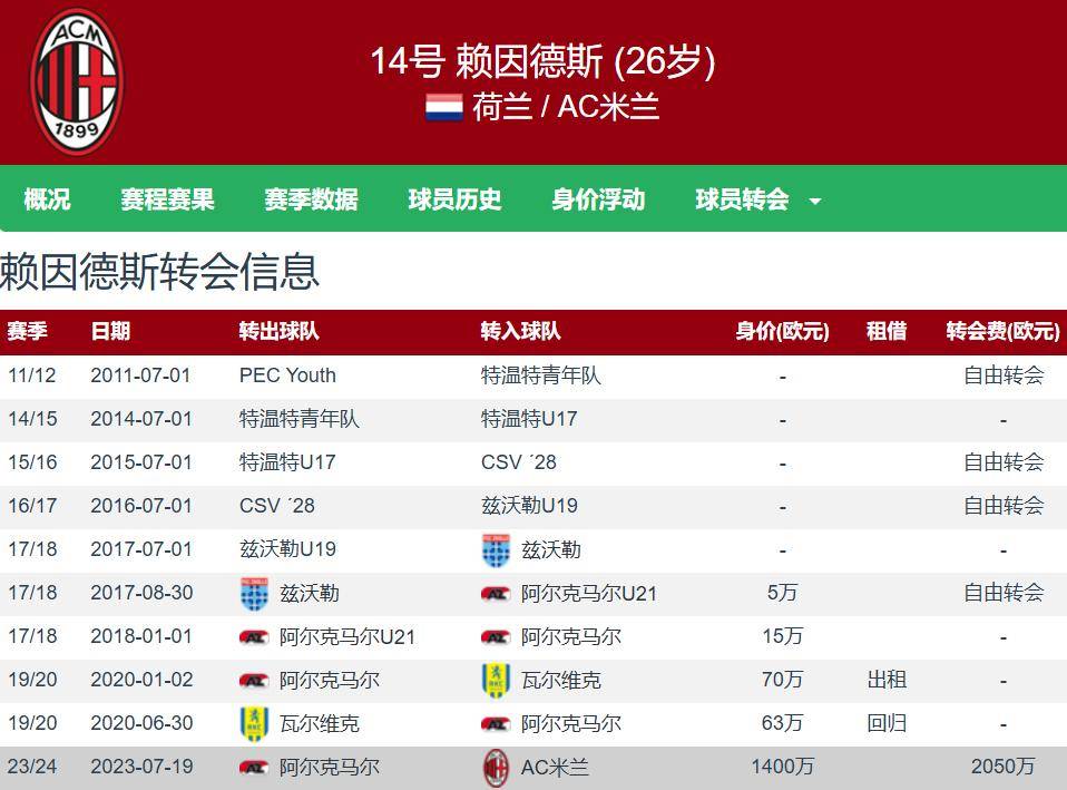 现年26岁的赖因德斯,身高1.85米,右脚球员,能踢中场、后腰、前腰,与米兰的合同至2030年,德转估价5000万欧元,曼城总价7000万欧元引进,米兰也算是大赚特赚。赖因德斯本赛季各项赛事共为米兰出场54次,其中53次首发,贡献15球4助。