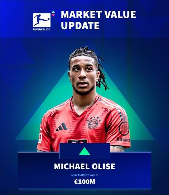穆西亚拉和维尔茨仍以1.4亿欧元的身价成为德甲身价最高的球员,奥利塞的身价上涨至1亿欧元,位列第三。