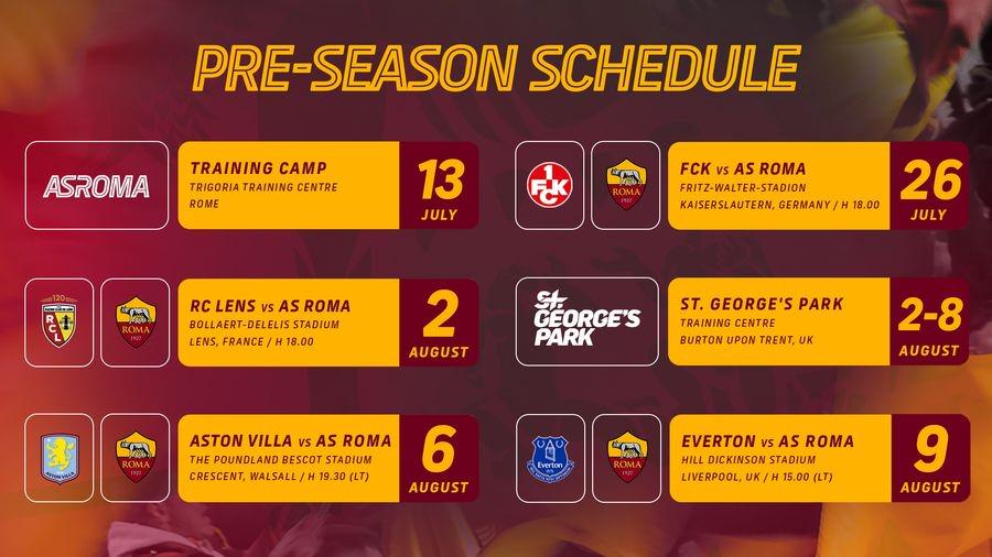 随后,罗马将前往英格兰,于8月2日至8日在伯顿的圣乔治公园训练基地进行集训。期间计划于当地时间8月6日20:30在沃尔索尔的贝斯科特体育场对阵阿斯顿维拉。