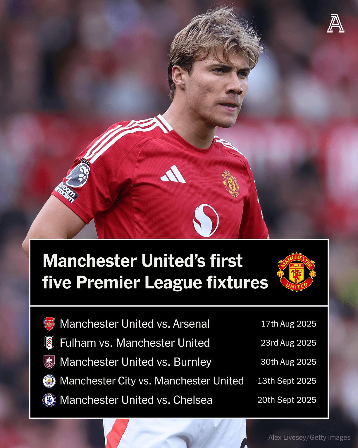 曼联还将早早客场挑战富勒姆,主场迎战升班马伯恩利。唯一可以安慰的是,前五场中有四场在曼彻斯特进行,对阵阿森纳和切尔西的比赛都在老特拉福德进行。