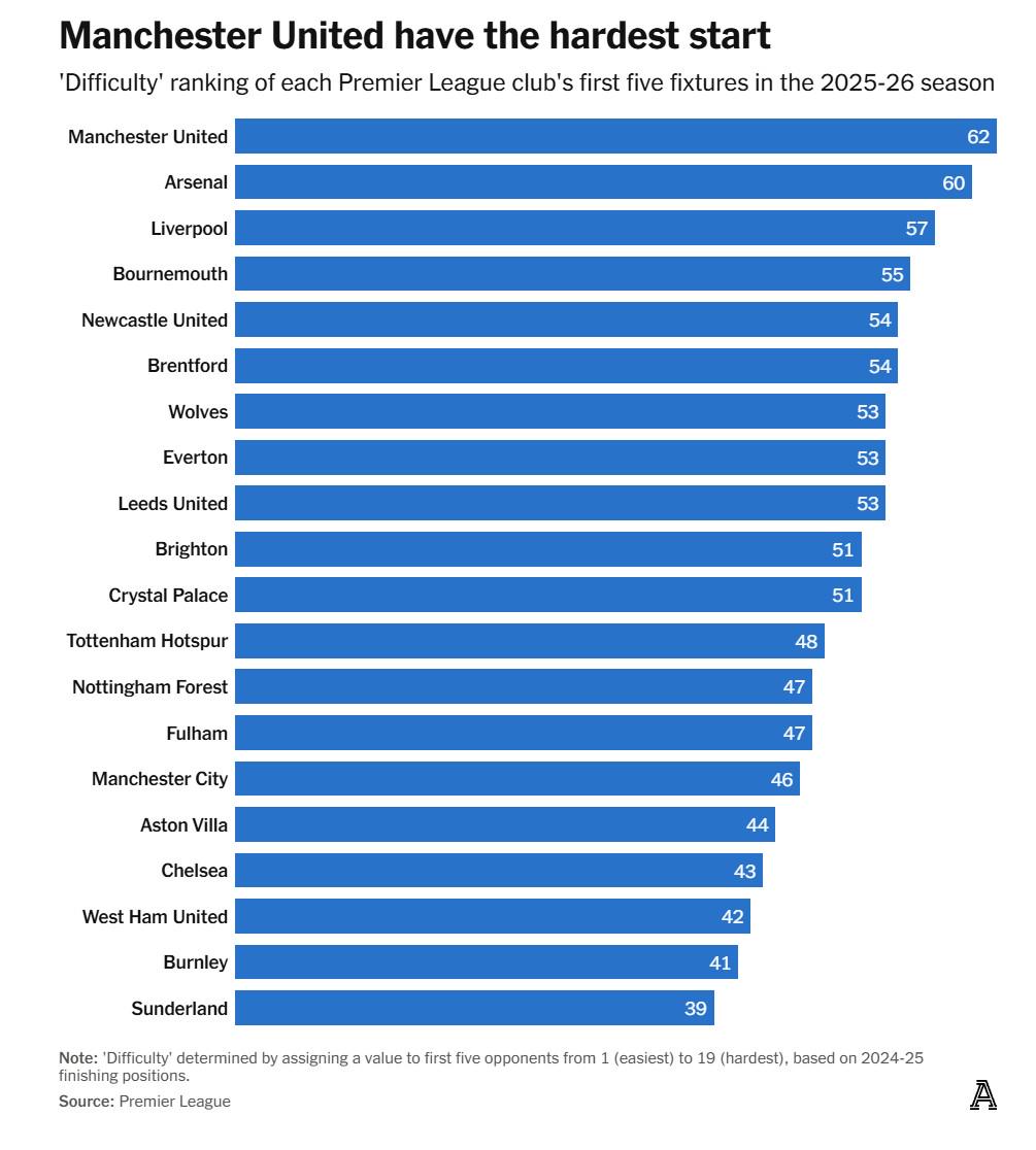 The Athletic根据上赛季的最终积分榜,对每支英超球队的前五场比赛进行了难度排名。我们将三支升班马分别视为上赛季排名第18、19和20位的球队。