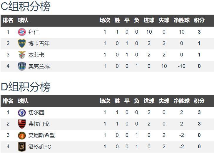 世俱杯C组和D组1轮战罢的积分情况如上图,第二轮各队需要拼命了,是左右出线局面的关键战,为你喜欢的球队加油助威或送上祝福语吧!
