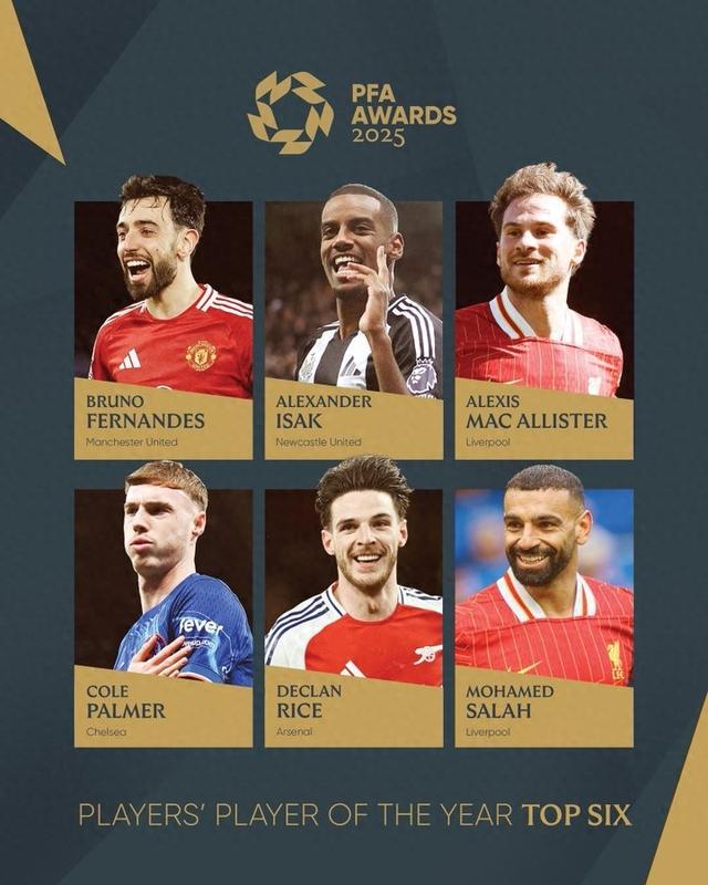 北京时间6月20日,英格兰职业足球运动员协会(PFA)公布了他们评选的年度最佳球员候选名单,其中B费、伊萨克、麦卡利斯特、帕尔默、赖斯、萨拉赫在列。