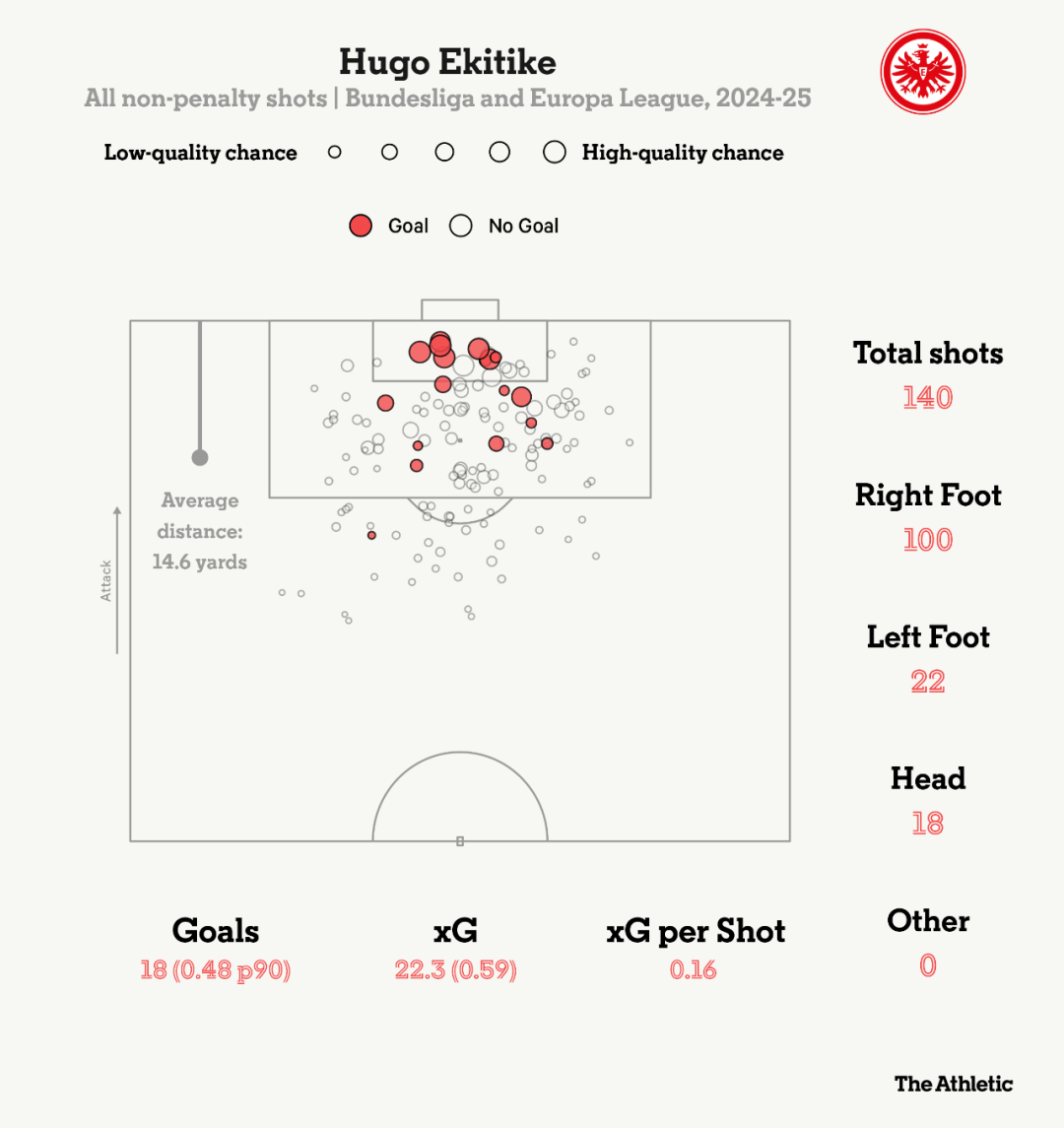 埃基蒂克在禁区内踢得非常聪明,而且动作速度也很迅速。在刚结束的2024/25赛季,只有姆巴佩、莱万多夫斯基、拉菲尼亚和萨拉赫创造了比他更多的预期进球数和预期助攻数。