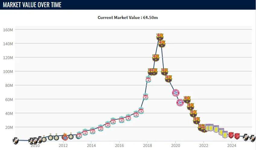 2018年,库蒂尼奥以1.35亿欧转会费加盟巴萨,当时他的巅峰身价高达1.5亿欧,而现在其身价仅有450万欧。加盟巴塞罗那后,库蒂尼奥承载着巨大的期望。尽管随队收获了西甲冠军、国王杯冠军等荣誉,但他始终未能完全融入球队战术体系,整体表现与高昂的身价相差甚远。后期,随着巴萨财政危机等问题浮现,他逐渐沦为边缘球员。2019年8月,库蒂尼奥租借加盟拜仁慕尼黑。在德甲赛场上,他随队实现了德甲冠军、欧洲冠军联赛冠军、德国杯冠军的三冠王伟业。然而,租借合同到期后,拜仁并未选择将他买断。