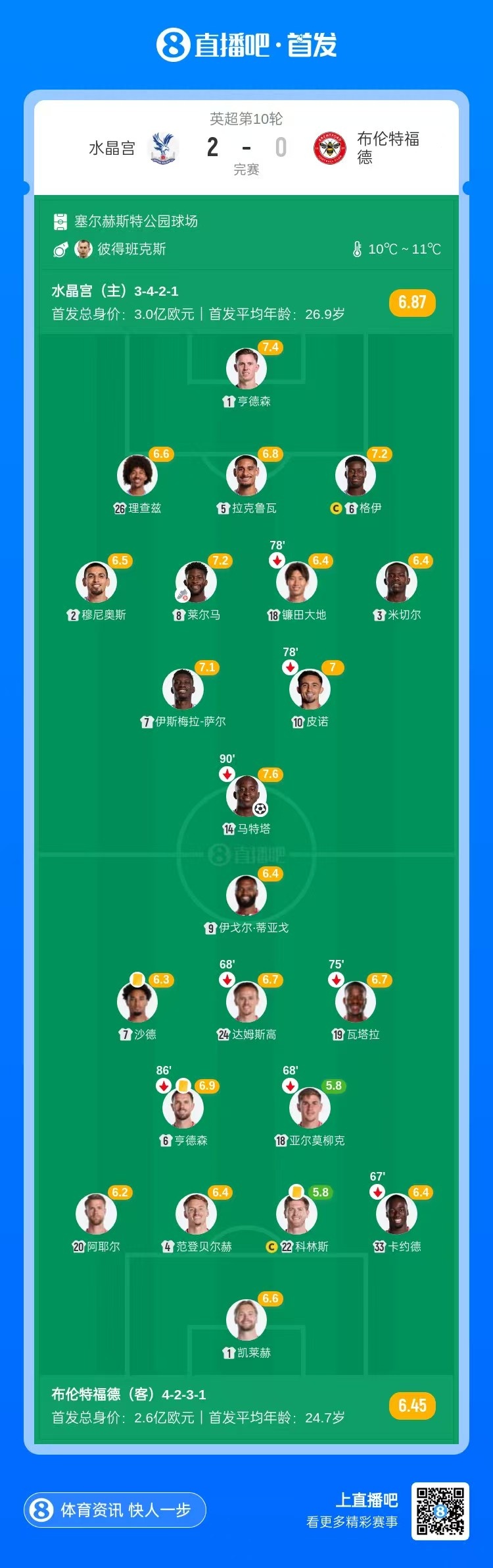 全场比赛结束,水晶宫2-0布伦特福德。