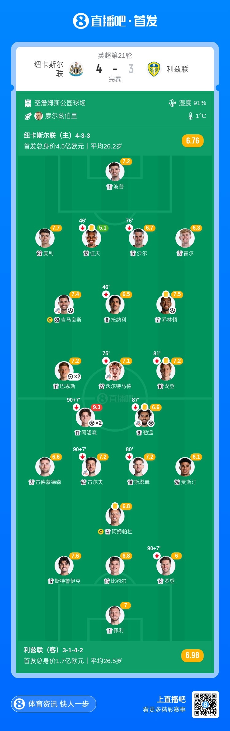 1月8日讯 北京时间4:15,英超第21轮纽卡斯尔联vs利兹联,比赛在圣詹姆斯公园球场打响!上半场,勒温助攻阿隆森先下一城,沃尔特马德助攻巴恩斯迅速扳平!半场补时阶段,佳夫手球送点,勒温点射破门。下半场,吉马良斯助攻乔林顿再次扳平!沙尔、贾斯汀相继中框!阿隆森梅开二度!补时阶段,阿隆森手球送点,吉马良斯点射绝平!读秒时刻,巴恩斯绝杀完成梅开二度!最终,纽卡4-3利兹联,英超取得3连胜!