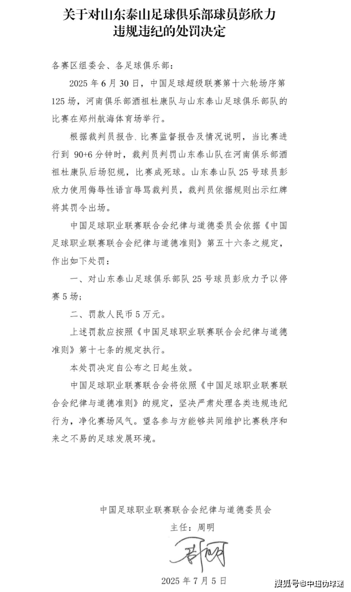 北京时间7月5日,在中超联赛进入间歇期之际,中足联再次开出重磅罚单,山东泰山球员彭欣力遭追加禁赛5场,创下了中超本赛季之最。