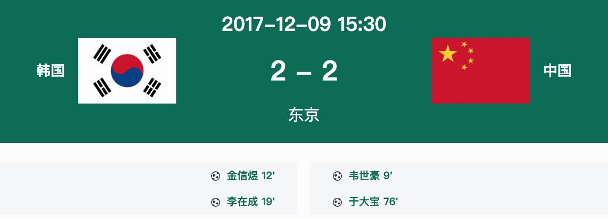 国足上次对阵韩国进球还是在2017年12月的东亚杯,当时国足在东京2-2战平韩国,韦世豪首开记录,于大宝攻入扳平比分的进球。