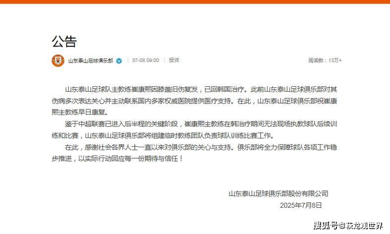 7月8日,山东泰山官方发布公告宣布,主教练崔康熙已返回韩国治疗旧伤,俱乐部对其伤病多次表达关心,并主动联系国内多家权威医院提供医疗支持。在此,俱乐部祝崔康熙早日康复。由于主教练无法现场执教球队后续训练和比赛,俱乐部将组建临时教练团队负责球队训练比赛工作。