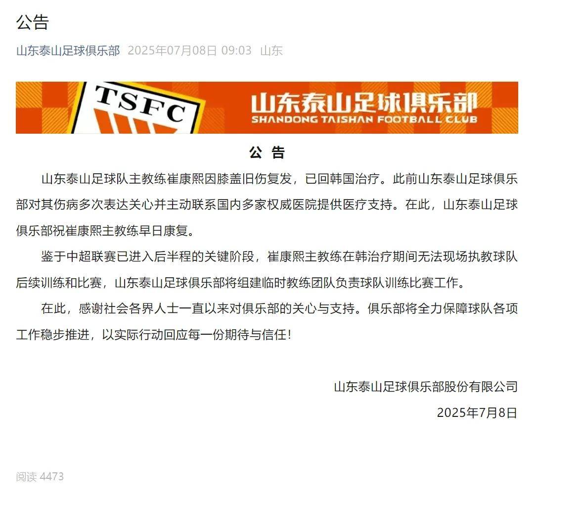 山东泰山官方宣布,主教练崔康熙因膝盖旧伤复发,已回韩国治疗。此前山东泰山足球俱乐部对其伤病多次表达关心并主动联系国内多家权威医院提供医疗支持。鉴于中超联赛已进入后半程的关键阶段,崔康熙在韩治疗期间无法现场执教球队后续训练和比赛,俱乐部将组建临时教练团队负责球队训练比赛工作。
