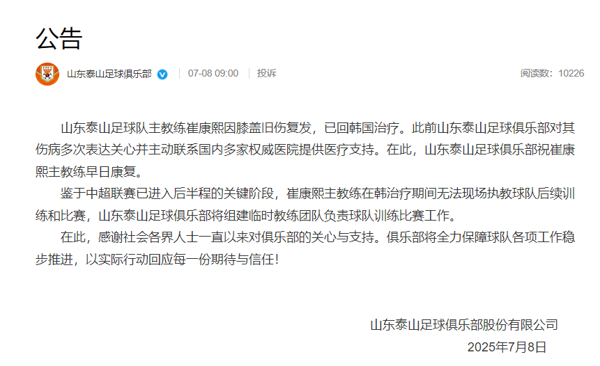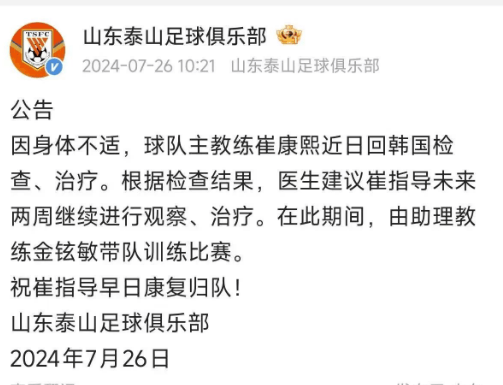 对于球队下半程的安排,山东泰山队官方宣布:“鉴于中超联赛已进入后半程的关键阶段,崔康熙主教练在韩治疗期间无法现场执教球队后续训练和比赛,山东泰山足球俱乐部将组建临时教练团队负责球队训练比赛工作。”这不是崔康熙第一次请假回韩国治疗,2024年7月26日,山东泰山队曾官方宣布,崔康熙回到韩国治疗,助理教练金炫敏负责带队训练比赛。