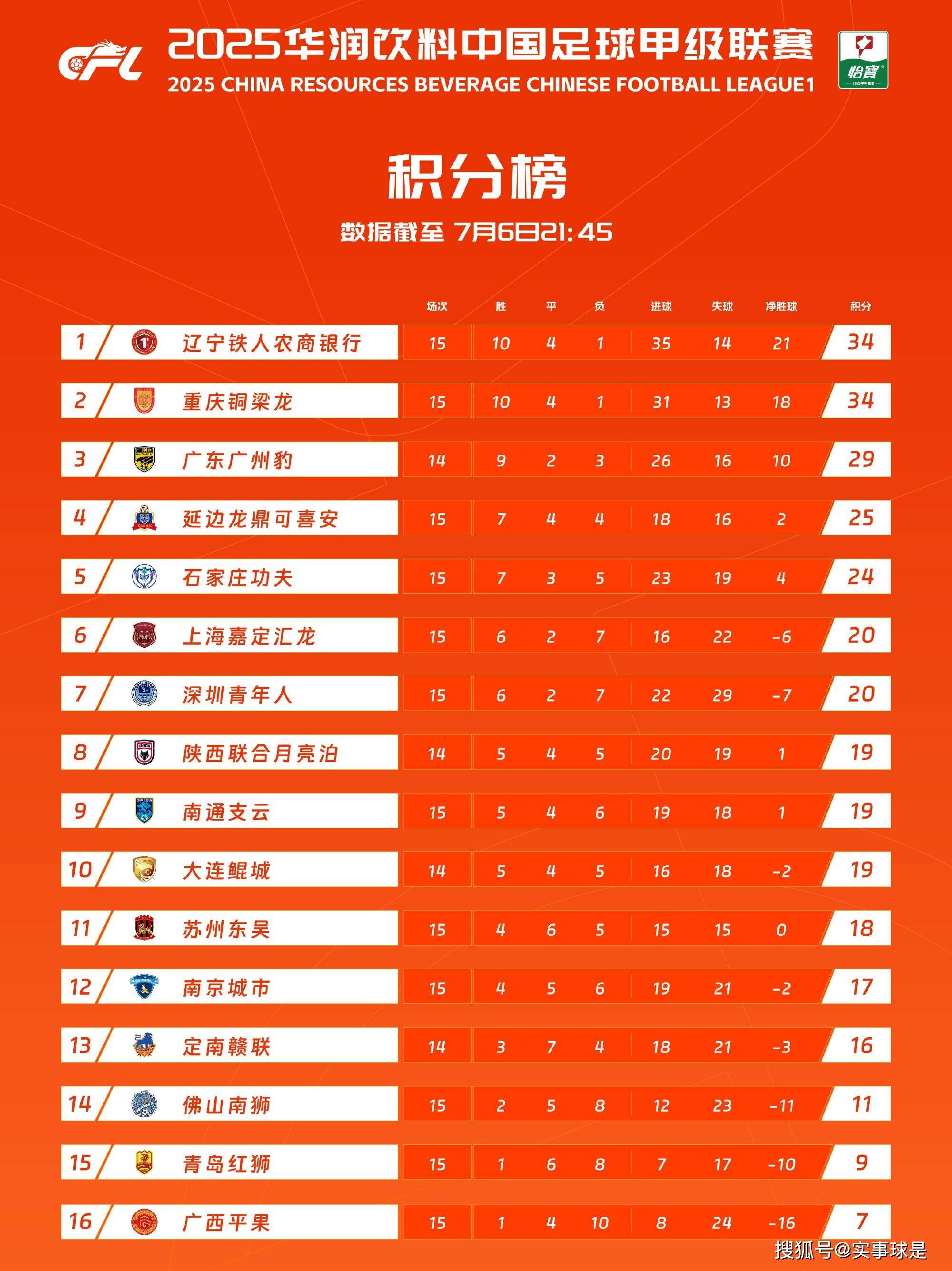 冲超区域,正如赛季初预料的那样,两大冲超热门辽宁铁人、重庆铜梁龙都取得了10胜4平1负积34分的战绩,携手领跑。如果赛季结束时,依然能保持这样的姿态,那他们将携手晋级2026赛季中超联赛。