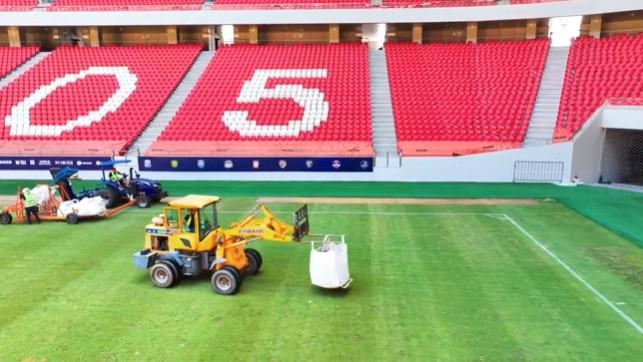 与此同时,海港队主场上汽浦东足球场正进行内场草坪的换草工作,草坪铣刨机通过旋转刀片的铣刨,同时完成铲草、松土、平整、装袋等工作,铲草后的草坪坪床非常平整。