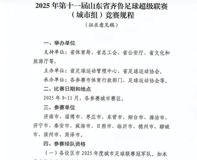 而在8日,据媒体人自由橙”透露好消息,山东省体育局发布重要文件,关于征求《2025年第11届山东省齐鲁足球超级联赛竞赛规程》,这也意味着鲁超联赛正式启动,此次分四个赛区,鲁北包括滨州、东营、德州和聊城,鲁南包括菏泽、济宁、枣庄和临沂,鲁中包括济南、泰安和淄博,鲁东包括烟台、威海、日照和潍坊。