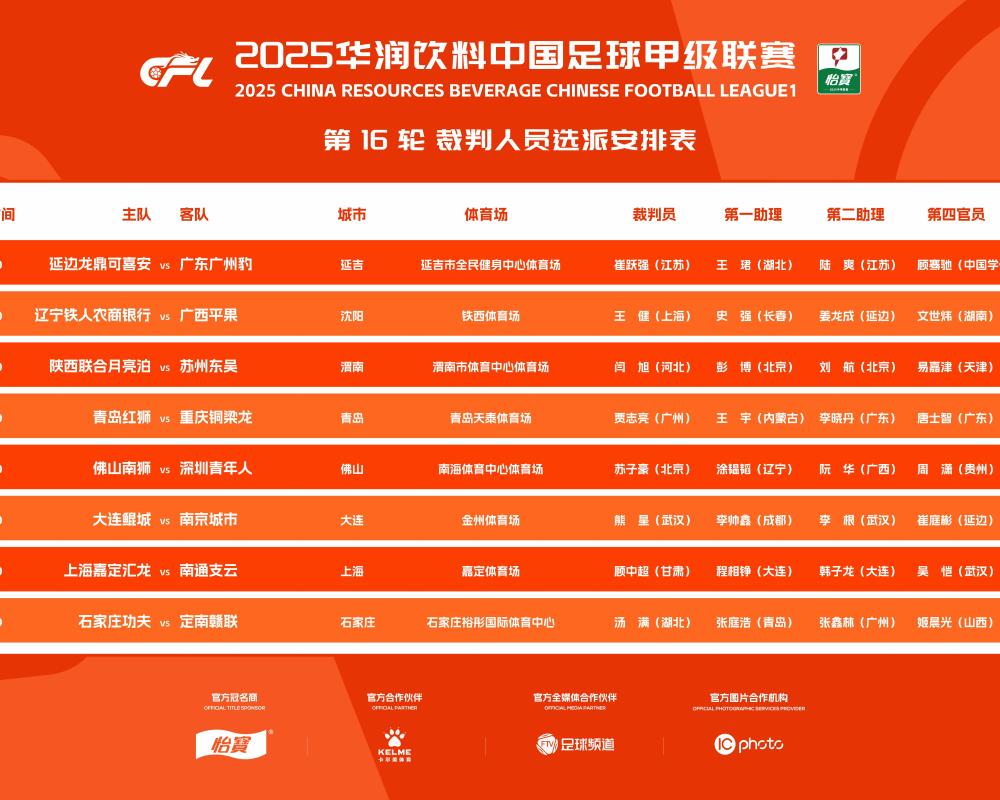 北京时间7月12日,中甲第16轮裁判名单公布,王健执法辽宁铁人vs广西平果,贾志亮吹青岛红狮vs重庆铜梁龙。