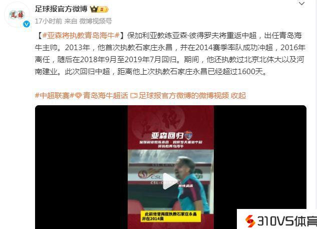 另外两支青岛球队也迎来好音讯,两支球队主教练确定,2大名帅驰援山东足坛。据多家媒体泄漏保加利亚教练亚森将重返中超,出任青岛海牛主帅。2013年,他初次执教石家庄永昌,并在2014赛季率队成功冲超,2016年离任,随后在2018年9月至2019年7月回归。时期,他还执教过北京北体大以及河南建业。
