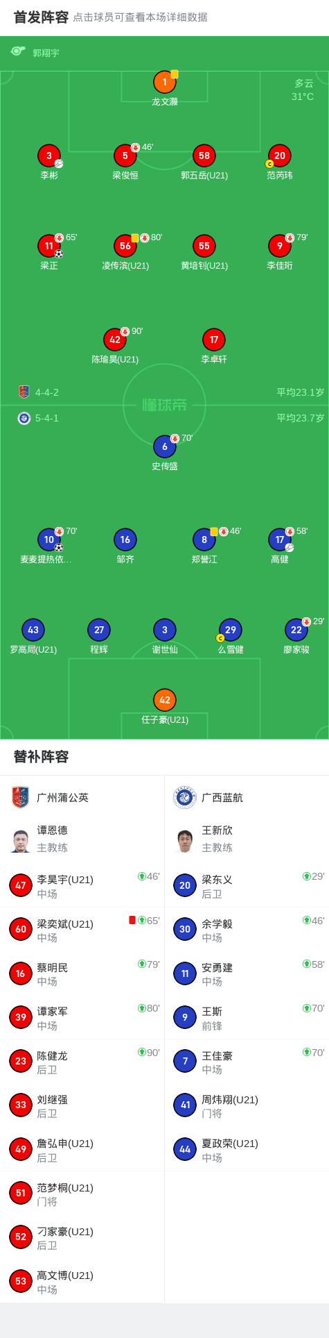 北京时间6月15日,中国足球乙级联赛预赛阶段第14轮,广州蒲公英主场迎战广西蓝航。比赛中,广西蓝航由麦麦提热依木-麦麦提艾力攻入一球,广州蒲公英则依靠梁正的进球扳平比分。最终,双方以1-1战平。此外,广州蒲公英的一名队员在比赛尾声阶段因领到红牌被罚出场。