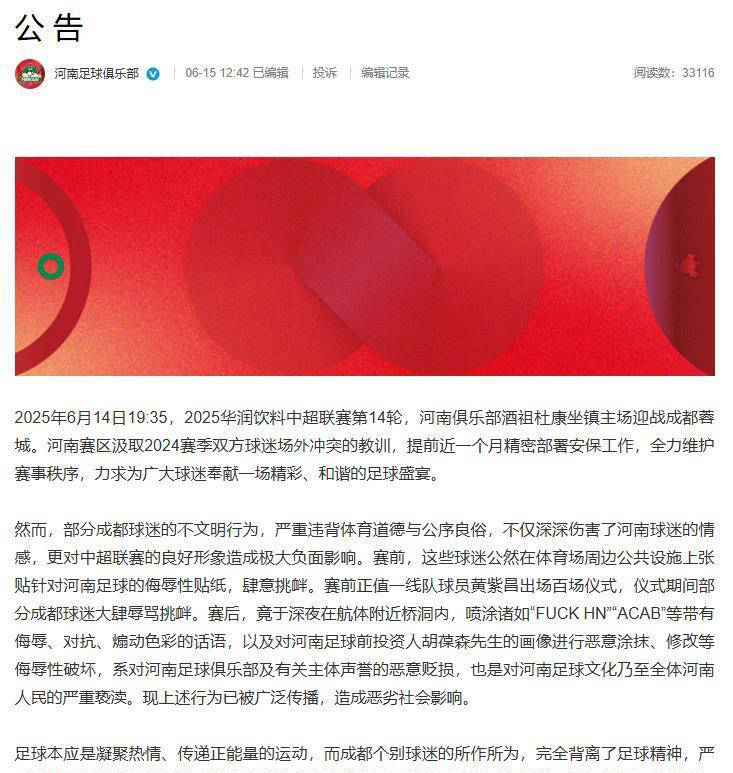 今日中午,河南队通过俱乐部的官方社交账号发布公告,直言极端成都球迷的行为严重践踏了河南的足球文化,这不仅深深伤害了河南球迷的感情,也对整个联赛形象造成了巨大的负面影响。河南队强调,如果这些极端行为得不到及时的、严肃的处理,很有可能引发更为严重的冲突。