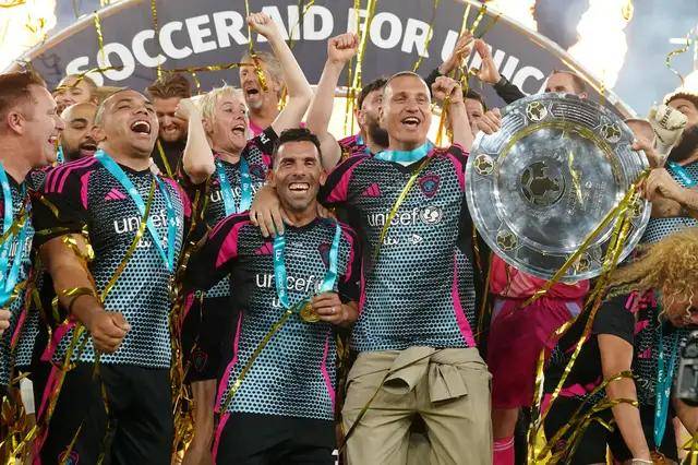 不过,这不妨碍这场慈善赛精彩而充满戏剧性的事实,在世界明星队中还有特维斯的前曼联队友、队长维迪奇,后者赛后与野兽一起愉快地庆祝了这个「冠军」。门将范德萨、全能后卫奥谢也参加了比赛,还有法国名宿特雷泽盖和巴西巨星里瓦尔多。