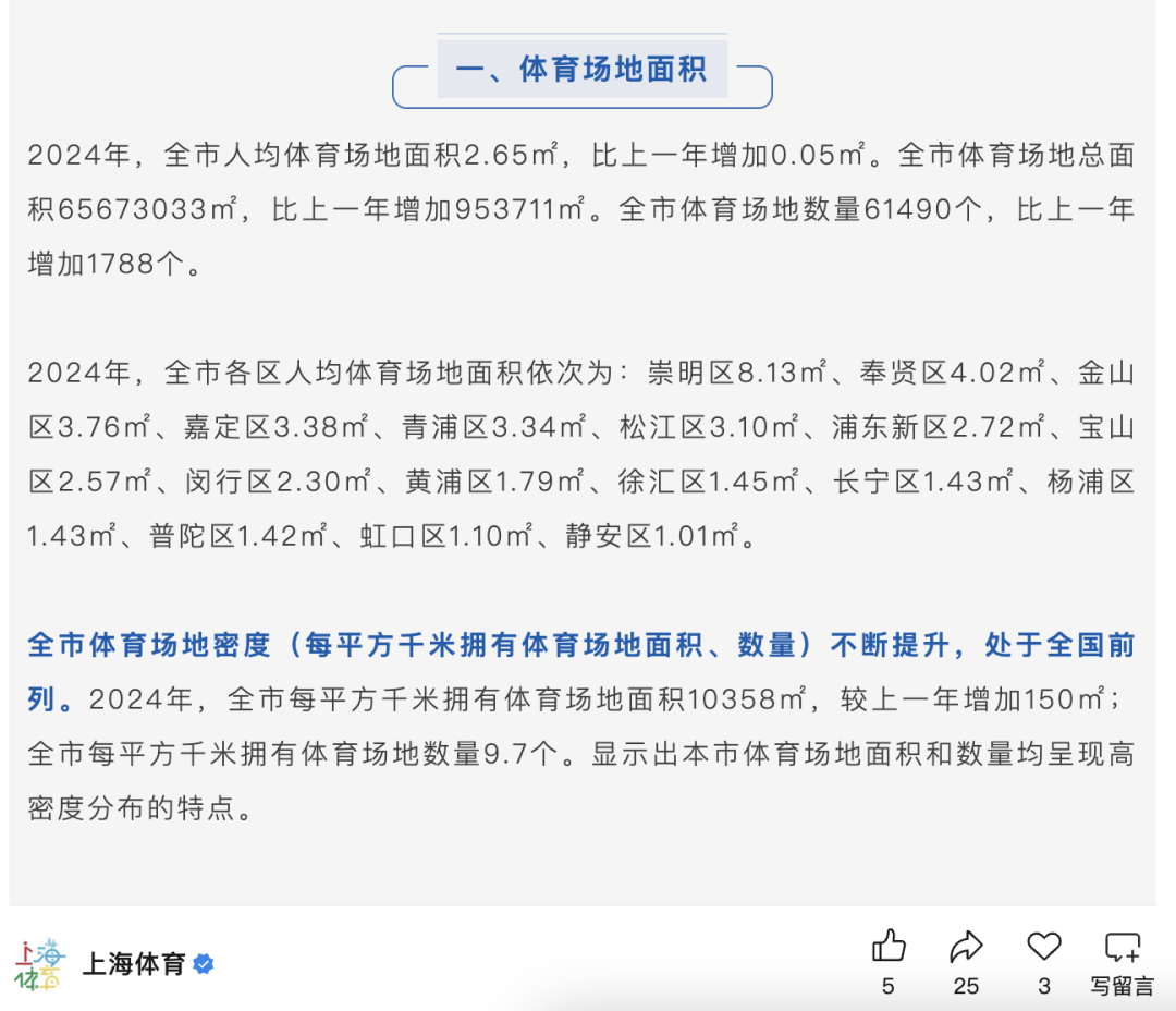 据上海体育局官方微信公众号“上海体育”,近日,上海市体育局、上海市城市规划设计研究院完成《2024年上海市健身设施建设补短板评估报告》。评估报告显示:截至2024年底,全市人均体育场地面积达到2.65㎡,提前超额完成上海体育“十四五”规划提出的2.6平方米目标,健身设施建设补短板取得积极成效。