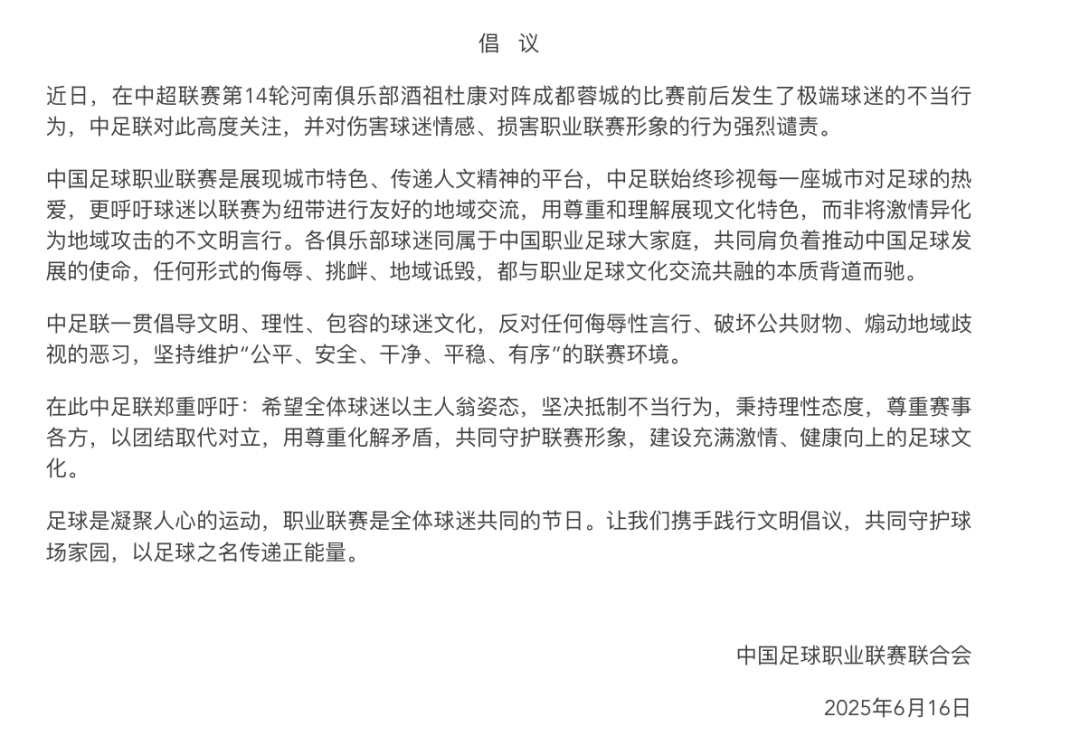近日,在中超联赛第14轮河南队对阵成都蓉城的比赛前后,部分成都极端球迷公然在体育场周边张贴针对河南足球的侮辱性贴纸,喷涂侮辱性话语,造成恶劣社会影响。对此,中国足球职业联赛联合会6月16日发文表示,对此次事件高度关注,并对伤害球迷情感、损害职业联赛形象的行为予以强烈谴责。中足联表示,中国足球职业联赛是展现城市特色、传递人文精神的平台,中足联始终珍视每一座城市对足球的热爱,更呼吁球迷以联赛为纽带进行友好的地域交流,用尊重和理解展现文化特色,而非将激情异化为地域攻击的不文明言行。各俱乐部球迷同属于中国职业足球大家庭,共同肩负着推动中国足球发展的使命,任何形式的侮辱、挑衅、地域诋毁,都与职业足球文化交流共融的本质背道而驰。