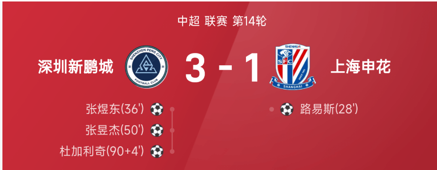 易边再战,双方都做出人员调整,第50分钟埃杜传中,无人跟防的张昱杰插入禁区内从容劲射反超比分,第94分钟,杜加利奇杀入申花禁区内一脚低射,洞穿薛庆浩把守的大门,为深圳新鹏城锁定胜局。