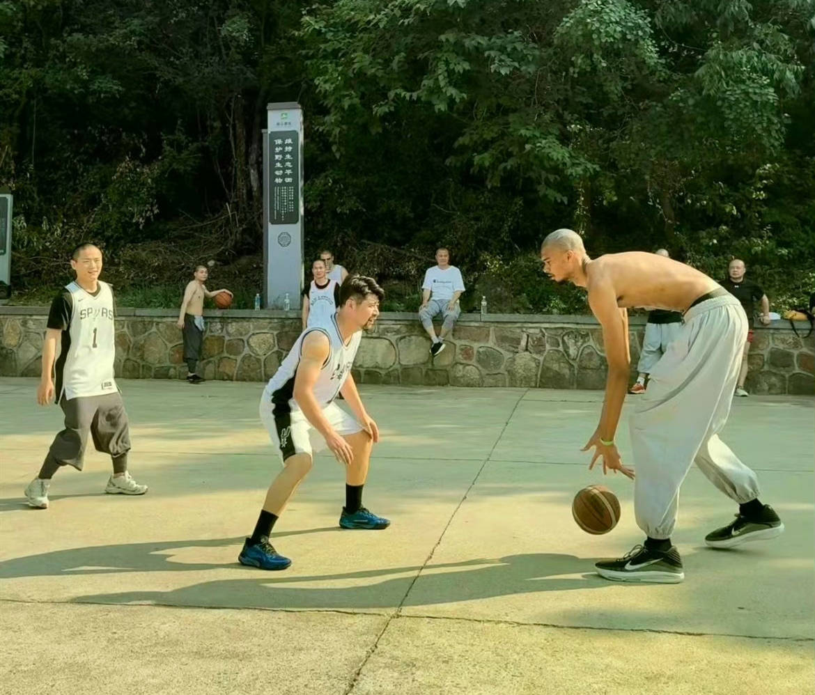 有意思的是,文班亚马还在嵩山和一群马刺迷打起了篮球。只见文班亚马赤裸上身,穿了宽大的少林寺僧侣长裤,脚上穿了篮球鞋,在弯腰控球。一位穿着马刺球衣的中年大叔防守文班亚马。两人身高差距太大了。这是在一片水泥地板的篮球场打球。