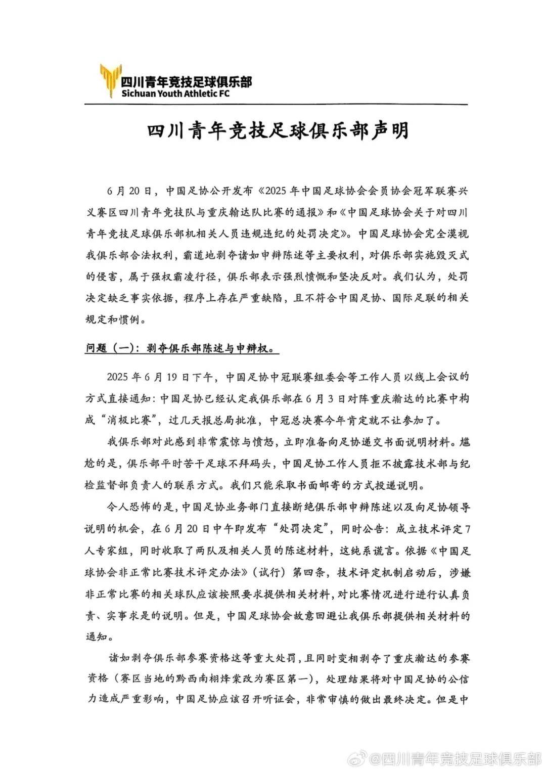 在声明中,四川青年竞技足球俱乐部表示:中国足球协会完全漠视我俱乐部合法权利,霸道地剥夺诸如申辩陈述等主要权利,对俱乐部实施毁灭式的侵害,属于强权霸凌行径,俱乐部表示强烈愤慨和坚决反对。我们认为,处罚决定缺乏事实依据,程序上存在严重缺陷,且不符合中国足协、国际足联的相关规定和惯例。