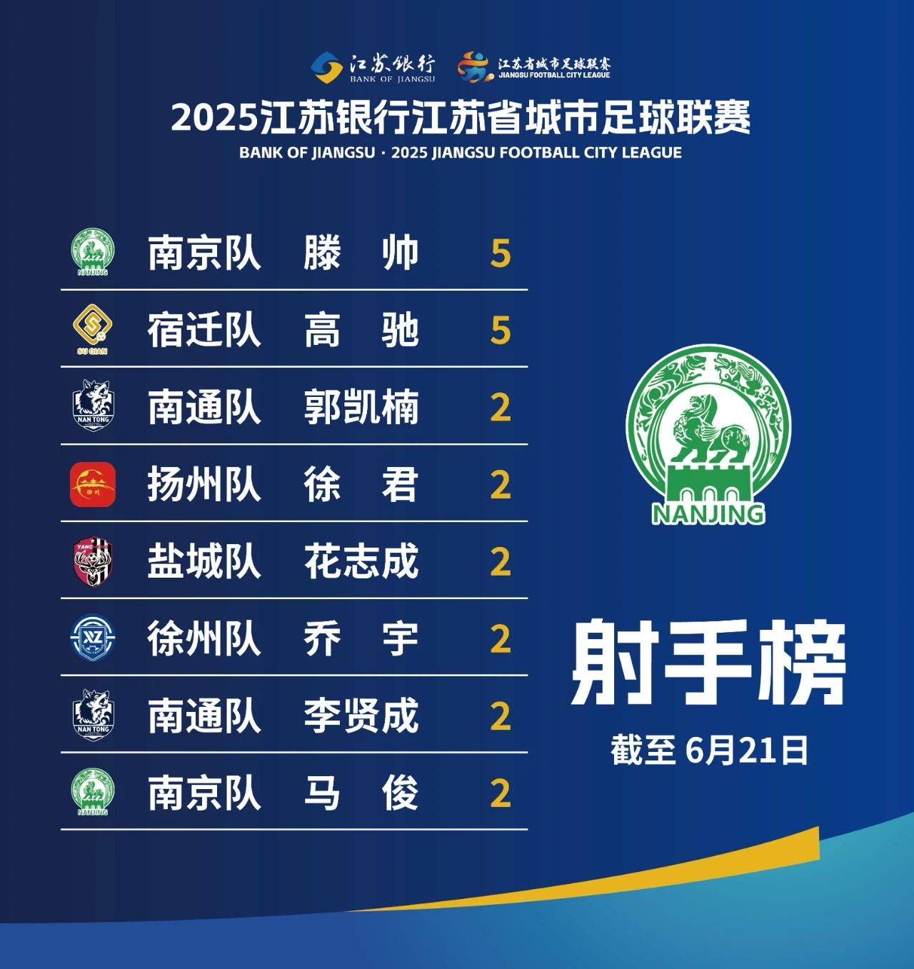 江苏苏超(江苏省城市足球联赛)在6月21日打了两场比赛,即第4轮延期的最后一场比赛,和第5轮提前的第一场比赛。王朝更迭不断,盐城仅仅登顶3个小时,南京又力压盐城登顶,不过盐城仍旧领跑苏北。