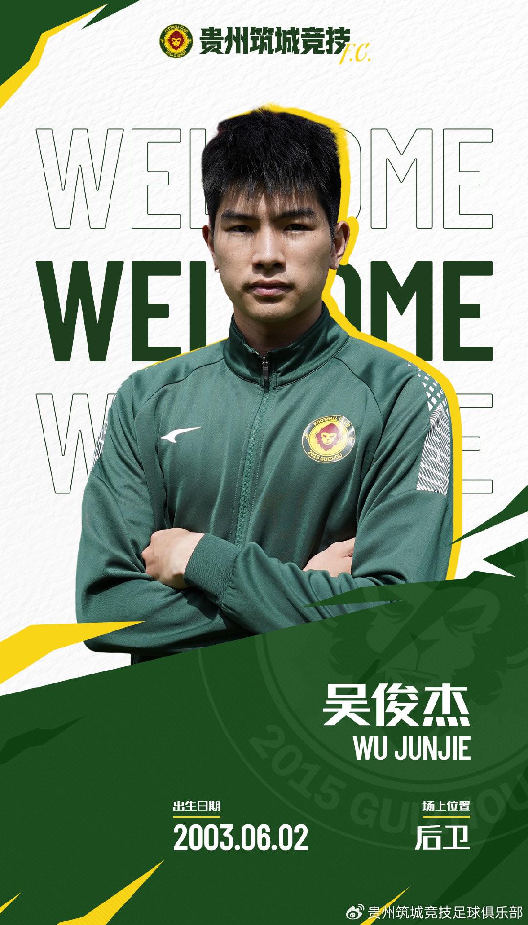 北京时间6月25日,贵州筑城竞技官方宣布,长春亚泰后卫吴俊杰、上海嘉定汇龙中场李习楠租借加盟俱乐部。
