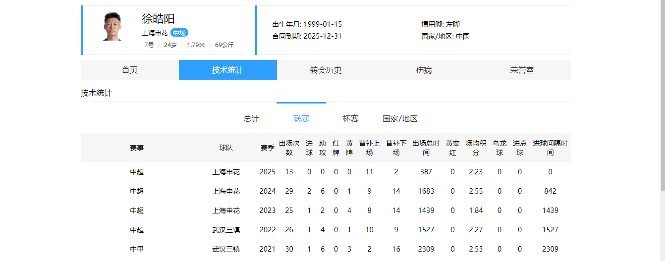 数据方面,徐皓阳上赛季共出战29场联赛,累计打进2球,送出6记助攻。本赛季15轮赛程过后,他共出场13次,没有进球和助攻入账。
