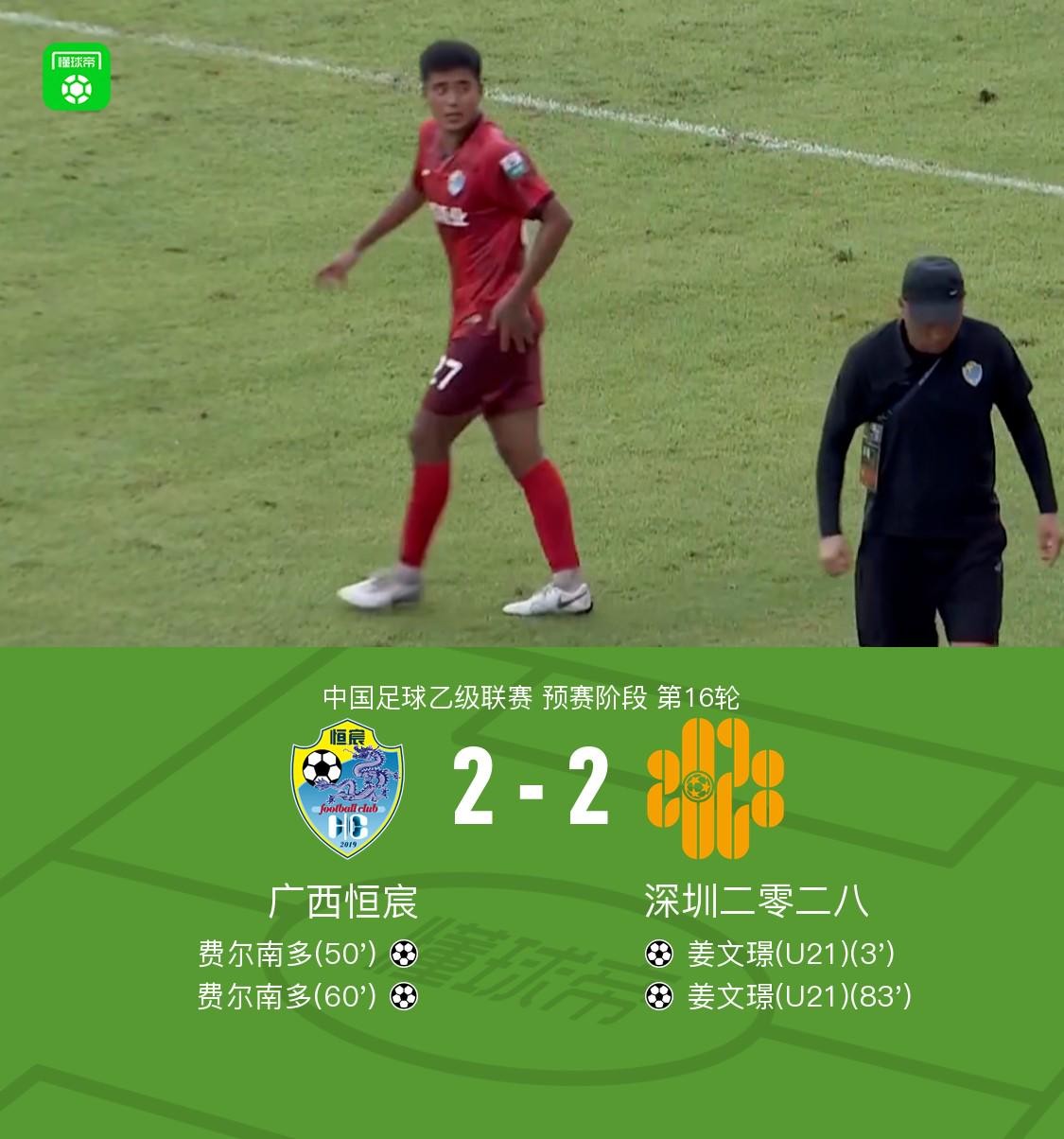 北京时间6月27日,中国足协乙级联赛预赛阶段第16轮,广西恒宸坐镇主场迎战深圳二零二八。比赛中,深圳二零二八球员姜文璟在队友黄梓舜的助攻下率先破门。随后,广西恒宸由张华峻送出助攻,费尔南多成功扳平比分。易边再战,李思琦精准传球帮助费尔南多再下一城,广西恒宸反超比分。比赛尾声阶段,深圳二零二八球员栾程助攻姜文璟完成破门,将比分最终定格为2比2。此役双方各取一分,上演了一场精彩的对攻战。