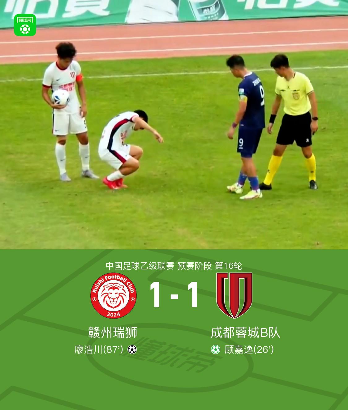 中国足球乙级联赛预赛阶段第16轮,赣州瑞狮坐镇主场迎战成都蓉城B队。比赛中,成都蓉城B队球员顾嘉逸成功罚入点球,为球队取得领先。比赛进入尾声阶段,赣州瑞狮球员李炎送出助攻,廖浩川抓住机会打入关键进球,帮助球队扳平比分。最终双方以1-1握手言和。
