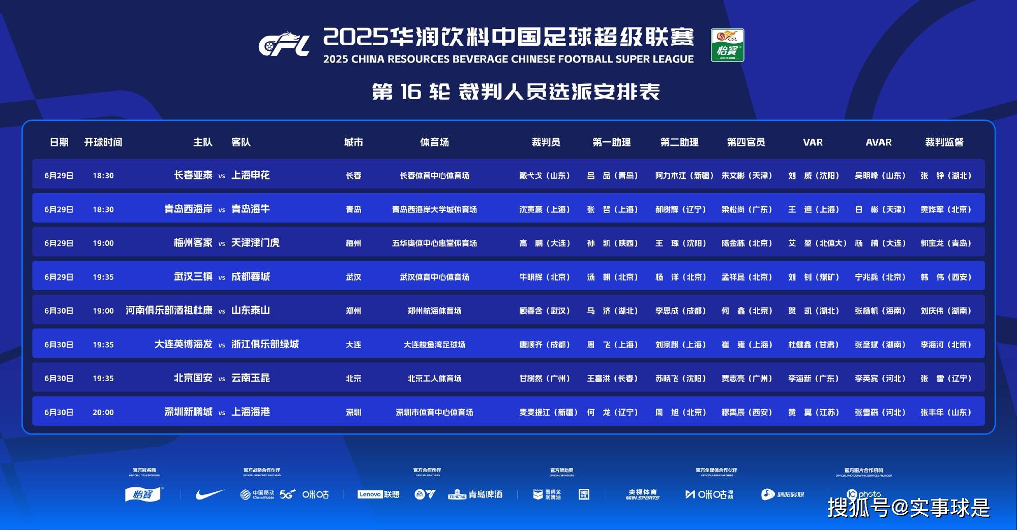 6月29日、30日,2025赛季中超展开第16轮,也就是下半程首轮角逐。赛前,中国足协发布了本轮裁判人员选派安排表。