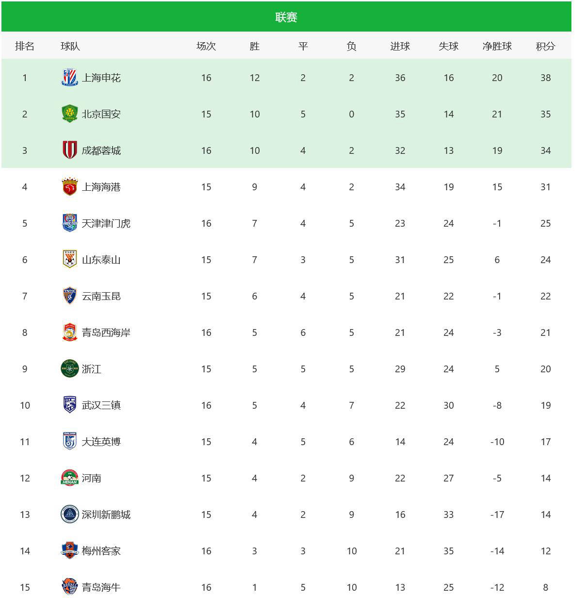 根据中超联赛最新积分榜显示,上海申花在客场取得3分后, 暂时升至榜首位置;而成都蓉城未能赢得本轮比赛,面临着被上海海港挤到第四名的风险。此外,保级方面,梅州客家、青岛海牛和长春亚泰这三支球队本轮都遭遇失利,积分与上轮持平。