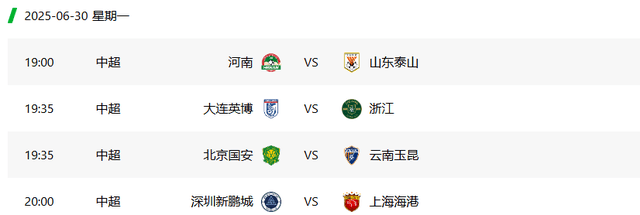 6 月 30 日,中超联赛还将进行北京国安对阵云南玉昆、上海海港对阵深圳新鹏城、大连对阵浙江以及河南对阵泰山等精彩赛事 。