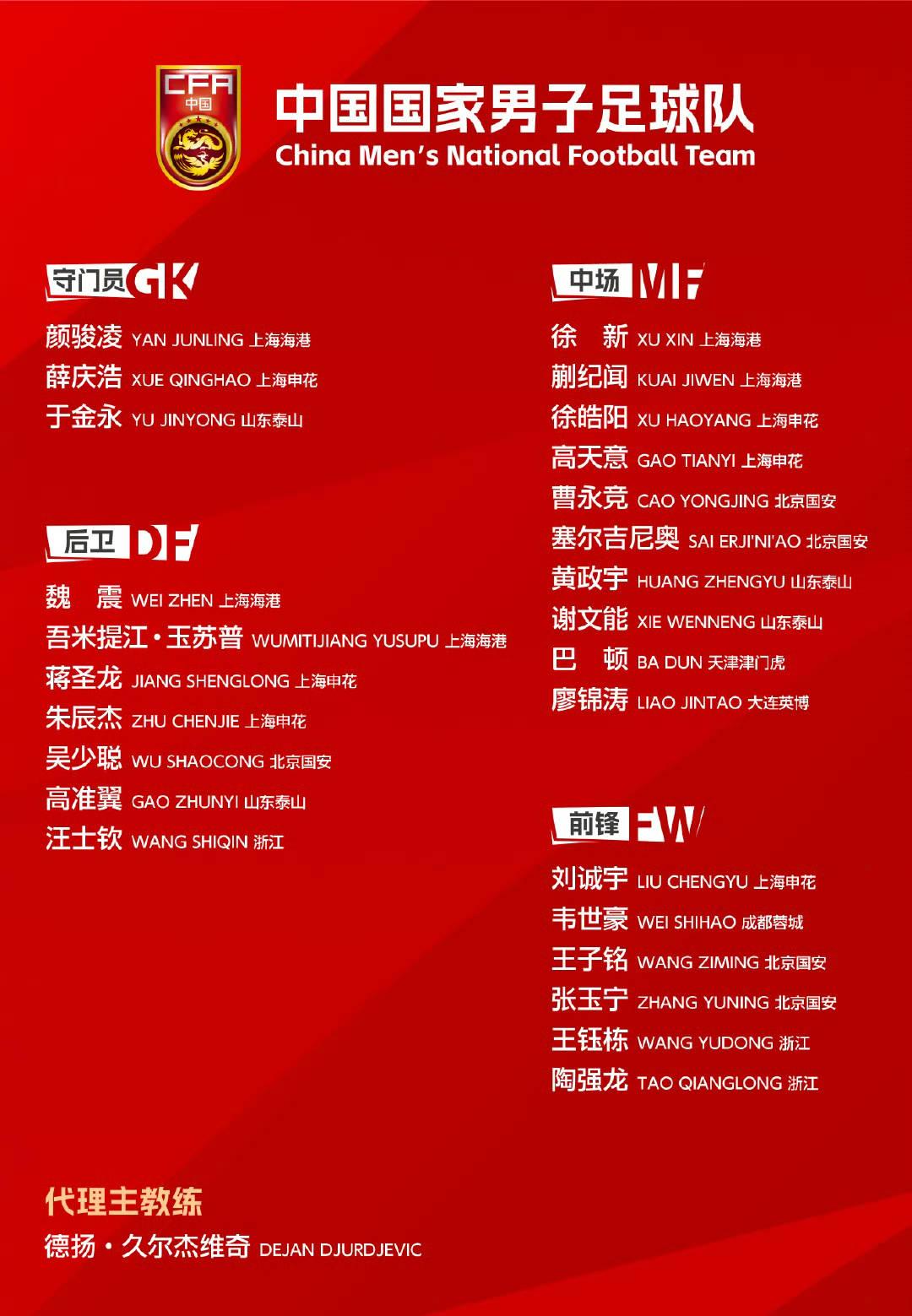 久尔杰维奇很了解中国足球,在上任之后、迅速敲定了东亚杯的26人大名单,国足官方宣布球队最新一期入选球员,阵容上进行了部分更新换代,但没有预期波及范围更大。这份名单主要是老中青三代相结合,每一个位置上都会留一名常规国足主力。国足将于7月2日前往大连集训,5日飞往韩国参加东亚杯的比赛,久帅的首秀同样也是考核。