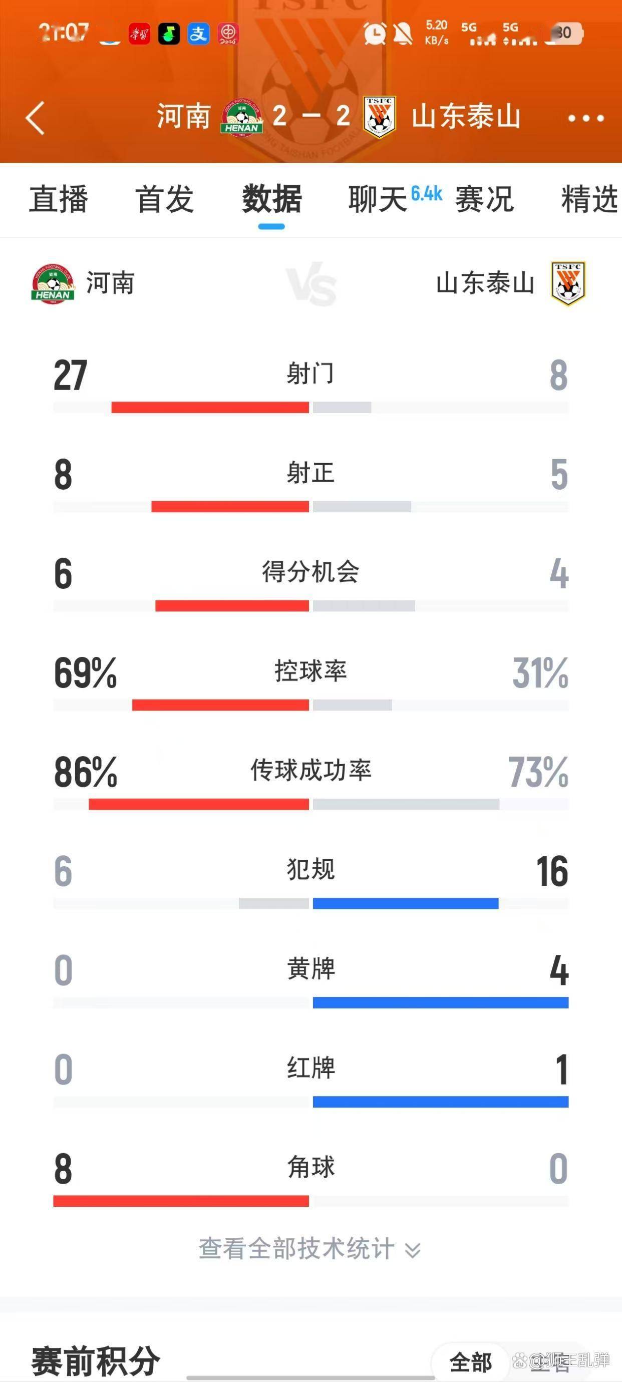 比赛进程也印证了这些数据。上半场,虽然泰山队凭借泽卡的梅开二度2 - 0领先,但从数据就能看出他们的优势并不稳固。河南队的射门数是泰山队的2倍多,控球率更是占据绝对主导。下半场,河南队的攻势如潮,连扳两球,将比分追平。卡多索的头球破门和点球命中,都是河南队持续施压的结果。反观泰山队,下半场几乎只有招架之功,没有还手之力,进攻端毫无章法,防守端漏洞百出,若非门柱和VAR的几次“帮忙”,他们甚至可能在客场输掉比赛。