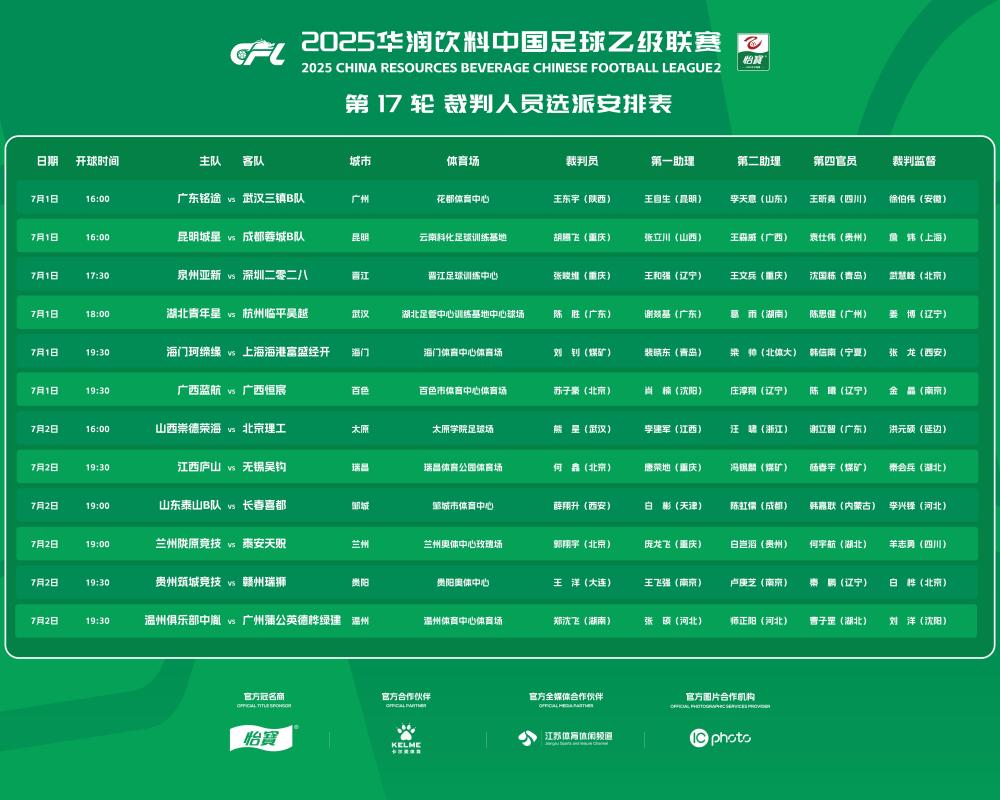 北京时间7月1日,中乙第17轮裁判名单公布,薛翔升执法山东泰山B队vs长春喜都。