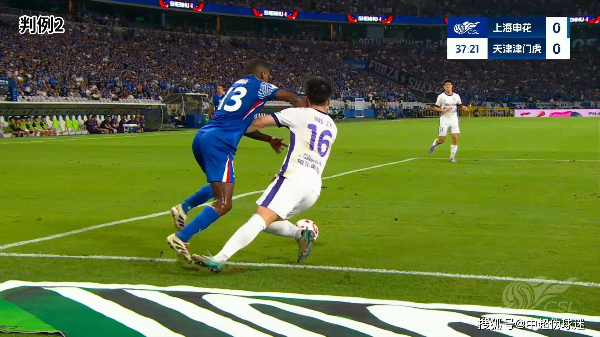 第二个判例在比赛当天引发的争议较大。这是比赛进行到第37分钟时,马纳法禁区底线与杨梓豪发生接触后倒地,当时VAR回看之后主裁判并没有判罚点球。申花申诉认为,杨梓豪放倒马纳法属犯规行为,应该判罚点球。